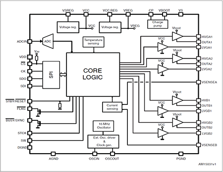 It integrates a dual full bridge gate driver for N-channel MOSFET power stages with embedded non dissipative overcurrent protection. Thanks to a new current control, a 1/16 microstepping is achieved through an adaptive decay mode which outperforms traditional implementations. The digital control core can generate user defined motion profiles with acceleration, deceleration, speed or target position easily programmed through a dedicated register set. All application commands and data registers, including those used to set analog values (i.e. current protection trip point, deadtime, PWM frequency, etc.) are sent through a standard 5-Mbit/s SPI. A very rich set of protections (thermal, low bus voltage, overcurrent and motor stall) makes the L6482 device “bullet proof”, as required by the most demanding motor control applications.
