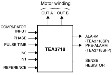 The circuits consist of an LS-TTL compatible logic input, a current sensor, a monostable and an output stage with built-in protection diodes. Two TEA3718 ICs and a few external components form a complete control and drive unit for LS-TTL or microprocessor-controlled stepper motor systems.