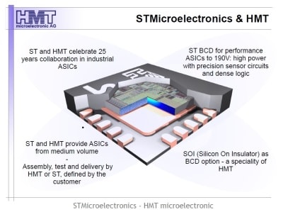 HMT microelectronic AG provides full custom mixed-signal ASIC product development for industrial, automotive, aeronautic, and medical applications in the high voltage and low consumption domains. The collaboration between STMicroelectronics and HMT microelectronic AG provides customers access to ASIC development in the ST's state-of-the-art technologies as BCD, SOIBCD, and CMOS. Assembly, test, and delivery are offered either under the responsibility of HMT or ST, depending on the requirements of the product, the customer, and volume.