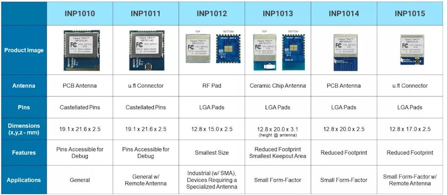 - 灵活的天线选项:PCB天线 (INP1010) 或U.FL连接器 (INP1011) 满足多样化设计需求