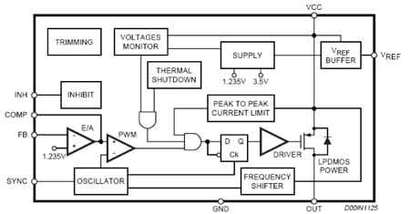 The A5973AD is a step-down monolithic power switching regulator with a minimum switch current limit of 1.8 A, so it is able to deliver up to 1.5 A DC current to the load depending on the application conditions. The output voltage can be set from 1.235 V to VIN. The high current level is also achieved thanks to an HSOP8 package with an exposed frame, that allows to reduce the Rth(JA)down to approximately 40 °C/W. The device uses an internal P-channel DMOS transistor (with a typical RDS(on)of 250 mΩ) as a switching element to minimize the size of the external components. An internal oscillator fixes the switching frequency at 500 kHz. Having a minimum input voltage of 4 V only it fits the automotive applications requiring the device operation even in cold crank conditions. A pulse-by-pulse current limit with the internal frequency modulation offers an effective constant current short-circuit protection.