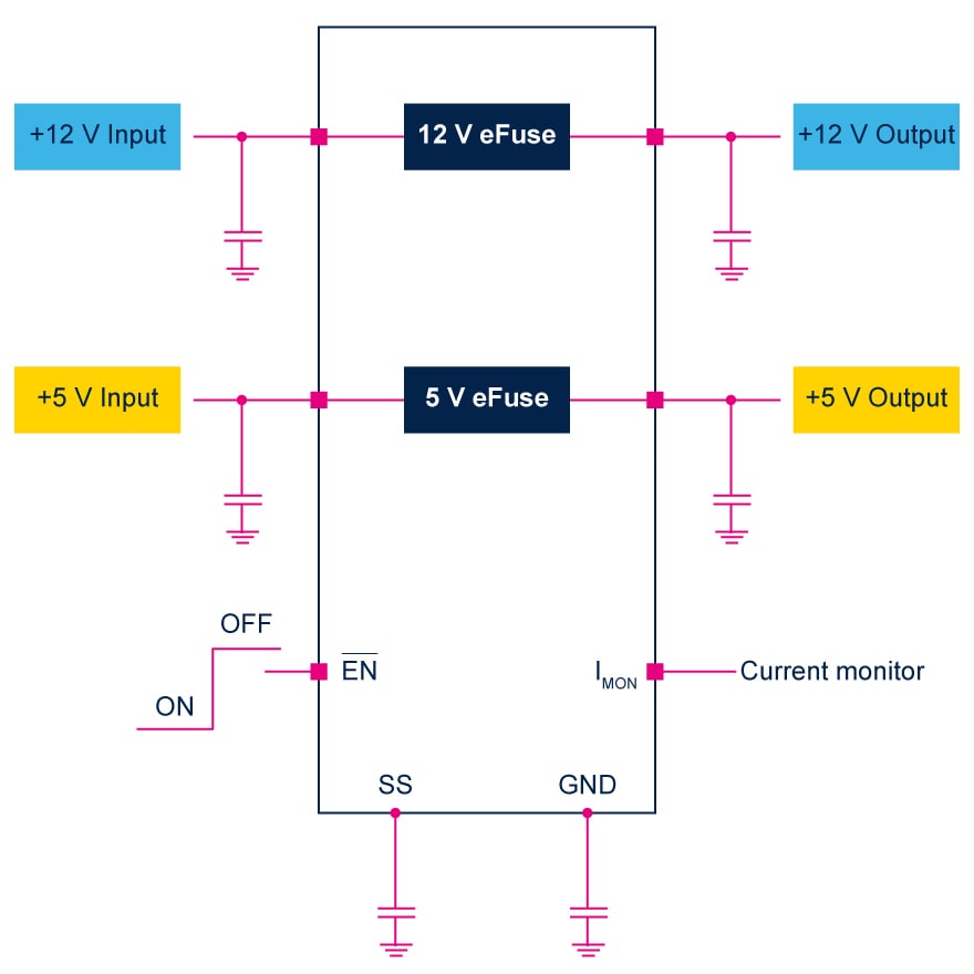 意法半导体的双通道eFuse在单个塑料封装中嵌入了两个电子保险丝:一个预设用于5 V电源轨,另一个用于12 V电源轨。