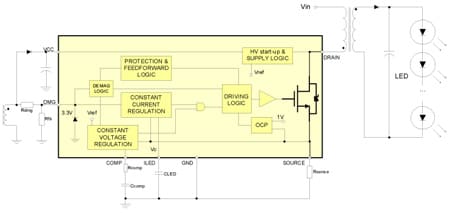 The PWM is a current-mode controller IC specifically designed for ZVS (Zero Voltage Switching) fly-back LED drivers, with constant output current (CC) regulation using primary-sensing feedback. This eliminates the need for the opto-coupler, the secondary voltage reference, as well as the current sense on the secondary side, still maintaining a good LED current accuracy. Moreover it guarantees a safe operation when short circuit of one or more LEDs occurs.