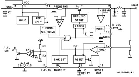 The L4963 is a monolithic power switching regulator delivering 1.5A at 5.1V. The output voltage is adjustable from 5.1V to 36V, working in discontinuous variable frequency mode. Features of the device include remote inhibit, internal current limiting and thermal protection, reset and power fail outputs for microprocessor.