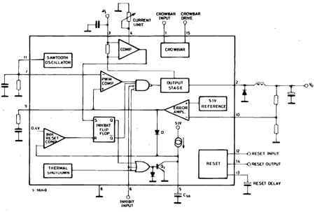 Features of the device include overload protection, soft start, remote inhibit, thermal protection, a reset output for microprocessors and a PWM comparator input for synchronization in multichip configurations.