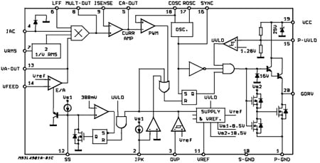 Realized in BCD 60II technology this power factor corrector (PFC) pre-regulator contains all the control functions for designing a high efficiency-mode power supply with sinusoidal line current consumption.