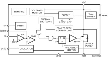 The device uses an internal P-Channel D-MOS transistor (with a typical of 200 mΩ) as switching element to avoid the use of bootstrap capacitor and guarantee high efficiency.