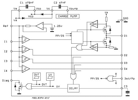 The L6374 is especially designed to be used as a line driver in industrial control systems based on the 24V signal levels (IEC1131, 24VDC).