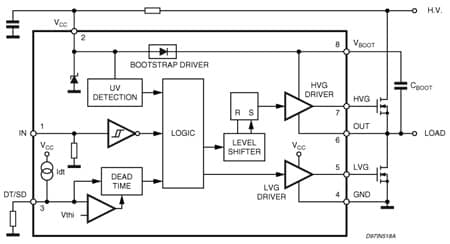 The L6384E device has one input pin, one enable pin (DT/SD) and two output pins, and guarantees matched delays between low-side and high-side sections, thus simplifying device's high frequency operation. The logic inputs are CMOS/TTL compatible to ease the interfacing with controlling devices. The bootstrap diode is integrated inside the device, allowing a more compact and reliable solution.