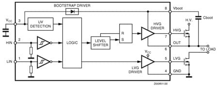 The L6387E device provides two input pins and two output pins and guarantees the outputs toggle in phase with inputs. The logic inputs are CMOS/TTL compatible to ease the interfacing with controlling devices.