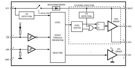 The high-side (floating) section is designed to stand a voltage rail up to 600 V. The logic inputs are CMOS/TTL compatible down to 3.3 V for the easy interfacing microcontroller/DSP.