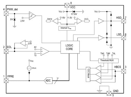 The IC is fully programmable using only resistors and offers over current protections, choke saturation control and hard switching protection thanks to a sophisticated current control circuit (CCC). In ignition, the CCC limits both the maximum lamp voltage in case of old or broken lamp, and also the lamp current in case of inductor saturation.