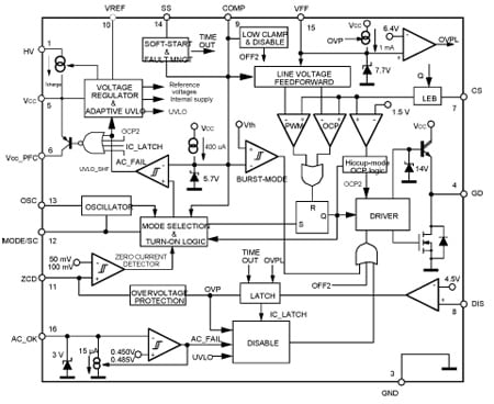 To allow the meeting of energy saving recommendations in two-stage power-factor-corrected systems as well, the L6566A provides an interface with the PFC controller that enables the re-regulator to be turned off at light load.