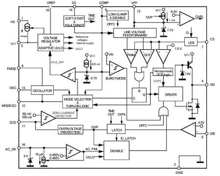 Programmable soft-start, leading-edge blanking on the current sense input for greater noise immunity, slope compensation (in FF mode only), and a shutdown function for externally controlled burst-mode operation or remote ON/OFF control complete the features of this device.