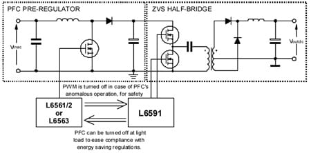 To allow compliance with these standards also in two-stage power-factor-corrected systems, an interface with the PFC controller is provided that enables the pre-regulator to be switched off between one burst and the following one.