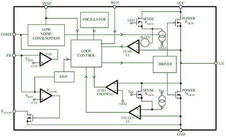 The device is a DC-DC monolithic regulator specifically designed to provide high efficiency. The L6928 supply voltage can be as low as 2 V to be used in single Li-Ion cell supplied applications. Output voltage can be selected by an external divider down to 0.6 V. Duty cycle can saturate 100% allowing low-dropout operation. The device is based on a 1.4 MHz fixed frequency, current mode architecture. Low consumption mode operation can be selected at light load conditions, allowing switching losses to be reduced. The L6928 is externally synchronized by a clock, which makes it useful in noise sensitive applications. Other features like Power Good, overvoltage protection, short-circuit protection and thermal shutdown (150 °C) are also present.