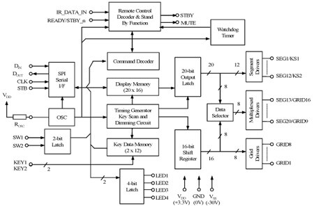 The STFPC311 integrates a VFD controller with a driver that is run on a 1/8 to 1/16-duty factor. It consists of 12 segment output lines, 8 grid output lines, 8 shared segments/grid output drive lines, a display memory, a control circuit, and a key scan circuit. Serial data is input to the STFPC311 through the SPI interface of a microcontroller (STB, DIN, DOUT, and CLK).