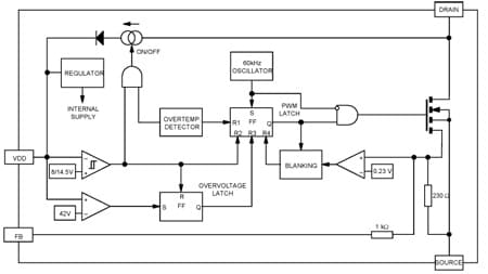 The internal control circuit offers the following benefits: Large input voltage range on the VDD pin accommodates changes in auxiliary supply voltage (This feature is well adapted to battery charger adapter configurations), automatic burst mode in low load condition and overvoltage protection in HICCUP mode.