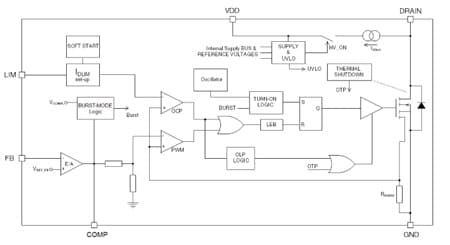 The design of flyback, buck and buck boost converters is supported. The integrated HV startup, sense-FET, error amplifier and oscillator with jitter allow complete application designs with a minimum number of components.