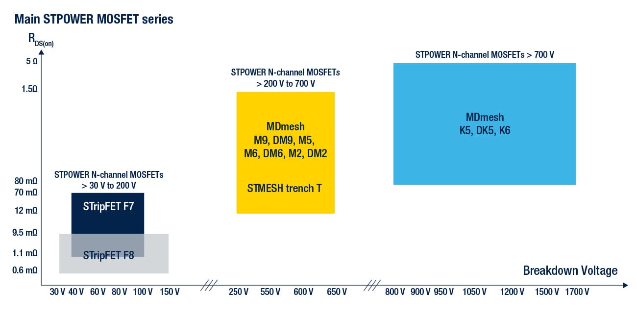 ST's high voltage MOSFET portfolio offers a broad range of breakdown voltages up to 1700 V, with low gate charge and low on-resistance, combined with state-of-the-art packaging. ST's MDmesh™ high-voltage MOSFETs technology has enhanced power-handling capability, resulting in high-efficiency solutions.