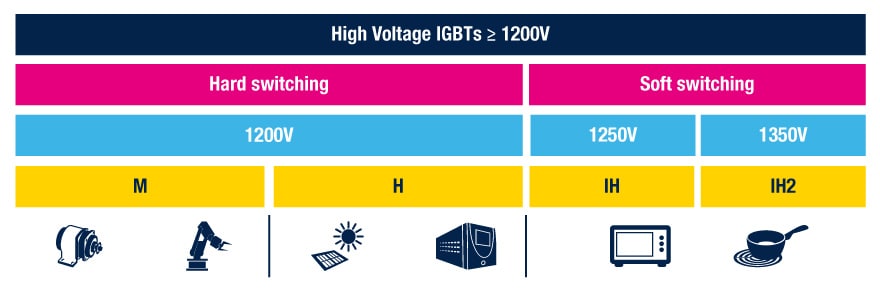 - IGBT IH2系列:高性能系列,电压不低于1350 V,最大电流35 A,已针对工作频率最高60 kHz的感应加热和软件开关应用进行优化。