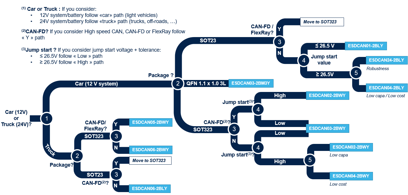 对于高速CAN,建议使用意法半导体的低电容(例如3 pF和17 pF)ESDCAN。对于低速CAN,建议使用电容为30 pF的保护器件,或与高速线路相同的低电容器件。有关产品详情,请参阅ESDCAN01-2BLY、ESDCAN03-2BWY和ESDCAN03-2BM3Y页面。前两种产品具有不同的电容值,而第三种产品具有低电容和小巧的外形。