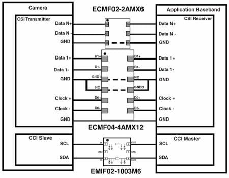 The device is a highly integrated common mode filter designed to suppress EMI/RFI common mode noise on high speed differential serial buses like MIPI D-PHY, MDDI or USB 2.0.
