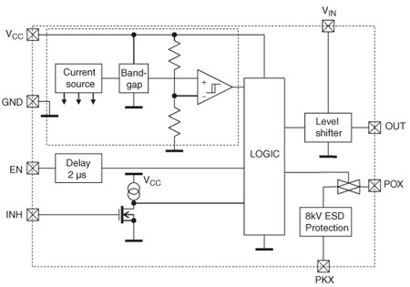 STM1068 device monitors supply voltage VCC and the state of EN and INH inputs. Depending on logical combination of these inputs, the output OUT is connected to VINor GND and the pass gate between PKX and POX is either enabled or disabled.
