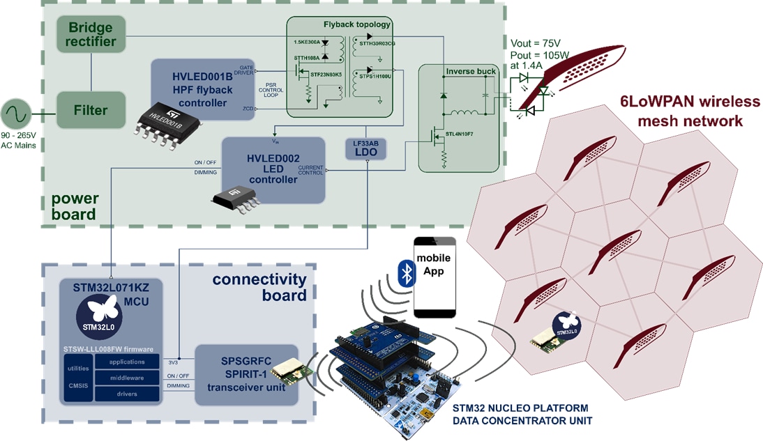 Digital control stage is performed by STM32L071KZ microcontroller, which can receive remote on, off and dimming commands via an embedded SPSGRFC sub-1 GHz transceiver module. The connectivity functionality can be extended to allow wireless control of multiple lighting nodes in a 6LowPAN mesh network.