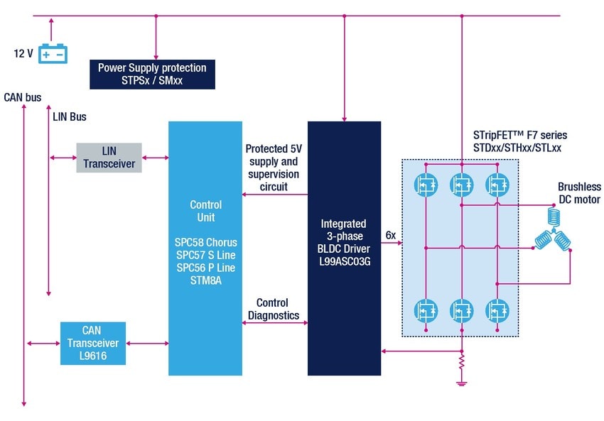A leading automotive supplier, ST offers a solution for 12V electric BLDC motors for water, coolant, oil and fuel pumps