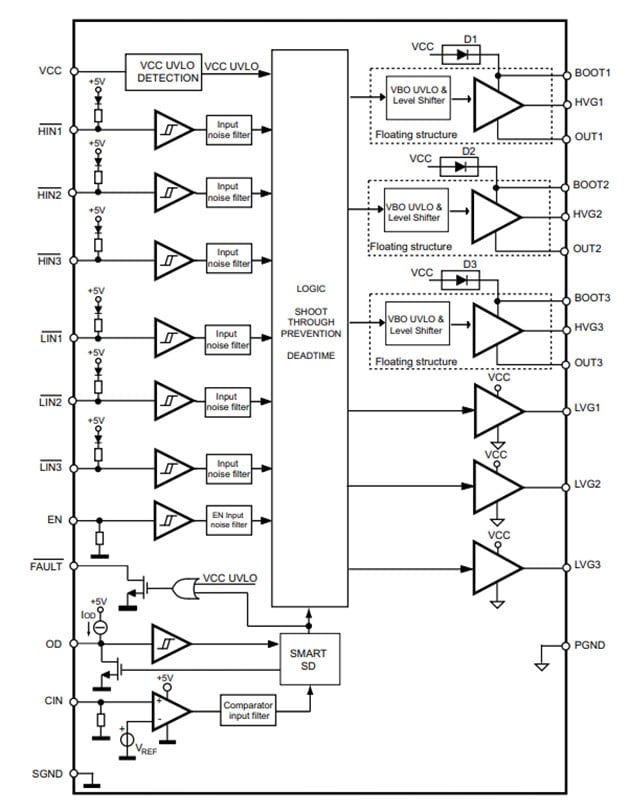 The STDRIVE601 is a high voltage device manufactured with BCD6s offline technology. It is a single-chip with three half-bridge gate drivers for N-channel power MOSFETs or IGBTs suitable for 3-phase applications.