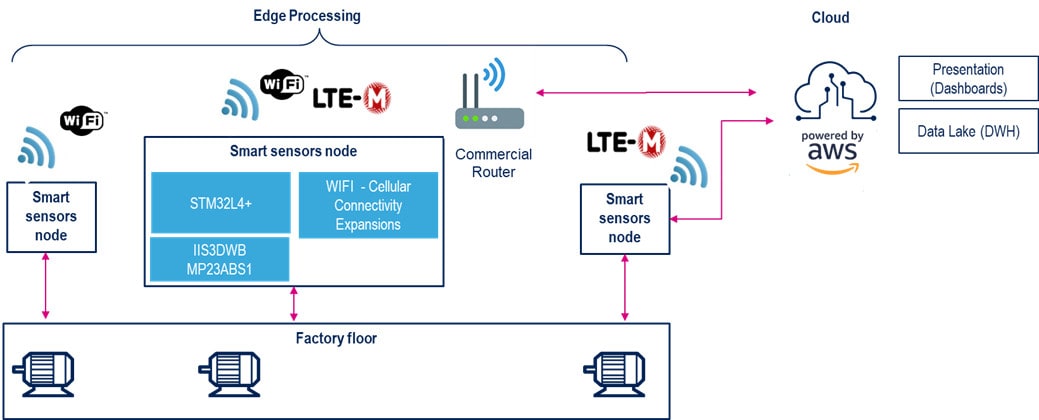 在预测性维护框架下,状态监测在智能工厂和工业4.0战略中发挥着重要作用 - 智能传感器节点收集振动、超声波和环境数据,然后通过Wi-Fi或蜂窝网络连接传输到一个中心数据湖或云服务进行共享和分析。