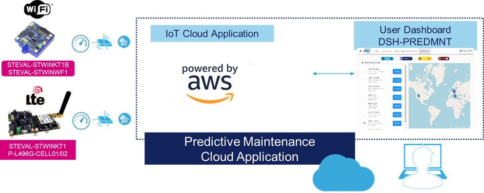 为了部署节点、图示数据和配置触发条件(作为端到端解决方案的一部分),意法半导体提供一个功能强大的直观型云平台(DSH-PREDMNT),用于对状态监控数据进行记录、可视化和分析。您可以使用仪表板绘制实时和历史数据图形,监测关键工作条件(如运行温度),并设置当关键参数超过可接受限值时的自动预警阈值。一旦收集并下载了数据,就可以开发自己的边缘处理和事件可视化算法。