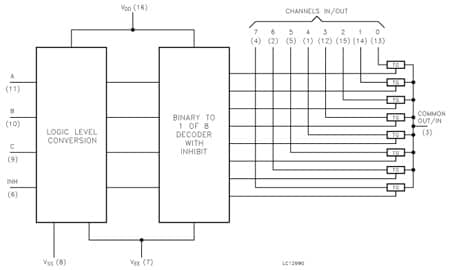 A, B and C control inputs select one channel out of eight. All inputs are equipped with protection circuits against static discharge and transient excess voltage.