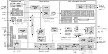 The FLI106xx series of ICs are single-chip TV solutions for products requiring superior 10-bit video quality in the analog and/or digital TV for ATSC, DVB, DTMB, NTSC, and PAL markets. They include a single-channel HD MPEG2 decoder and a secondary PIP channel, flexible analog front-end with an integrated Faroudja 3D video decoder, high-performance industry standard 32-bit MIPS 4Kec processor (250 MIPS), multi-standard analog audio decoder, digital audio decoder and post processor, three programmable Multimedia Processing Engines (MPEs), advanced 2D graphics engine, integrated HDMI 1.3/DVI receivers with integrated HDCP support, and a unified DDR memory controller.