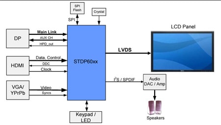 The output section contains a dual channel 8-bit LVDS transmitter for direct interfacing of commercially available LVDS LCD panel module. In addition, STDP60xx includes an integrated x86 OCM with SPI compatible interface, advanced color control features, a multicolor proportional font OSD engine, and a number of system I/O components.
