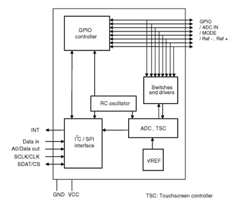The STMPE610 is a GPIO (general purpose input/output) port expander able to interface a main digital ASIC via the two-line bidirectional bus (I2C). A separate GPIO expander is often used in mobile multimedia platforms to solve the problems of the limited amount of GPIOs typically available on the digital engine.